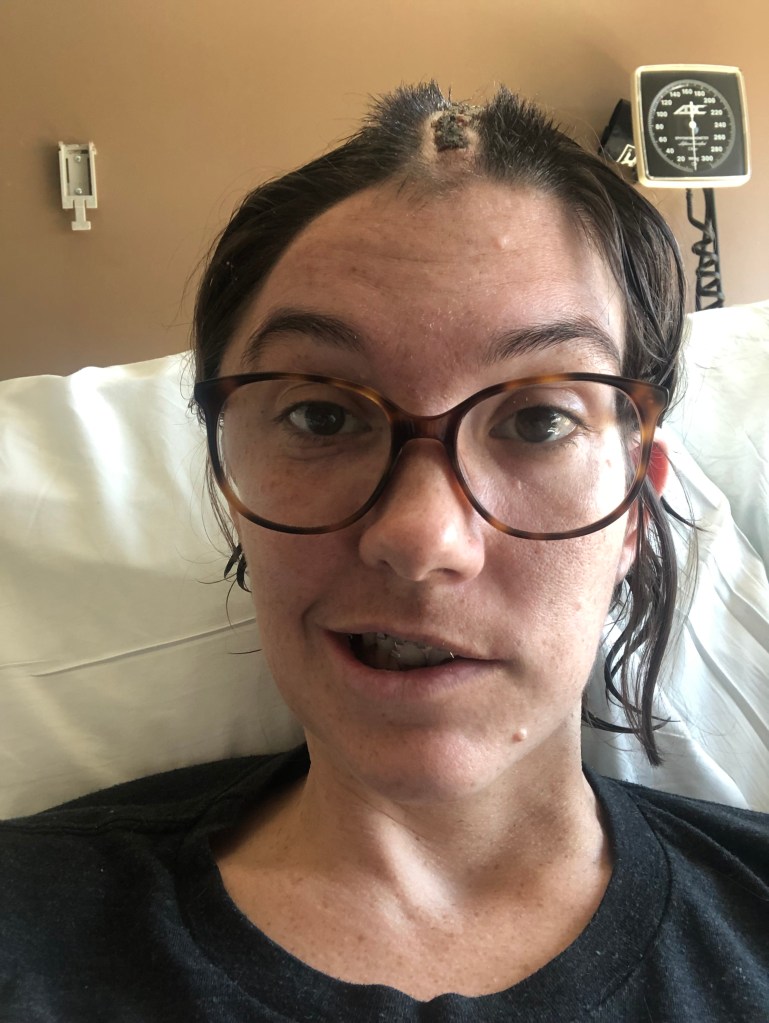 “Hi!! do you remember me?!” the woman was in surgical scrubs with dark brown hair, square glasses surrounding her dark brown eyes, “i’m Jodi, from Neuro surgery, i just wanted to come say hi and good luck!” i recognized her voice, but didnt remember her face. “i used to dance too!” she said, inspecting my head, “i’m sorry for everything you are going through but you’re strong and young and you’ll get through this!”